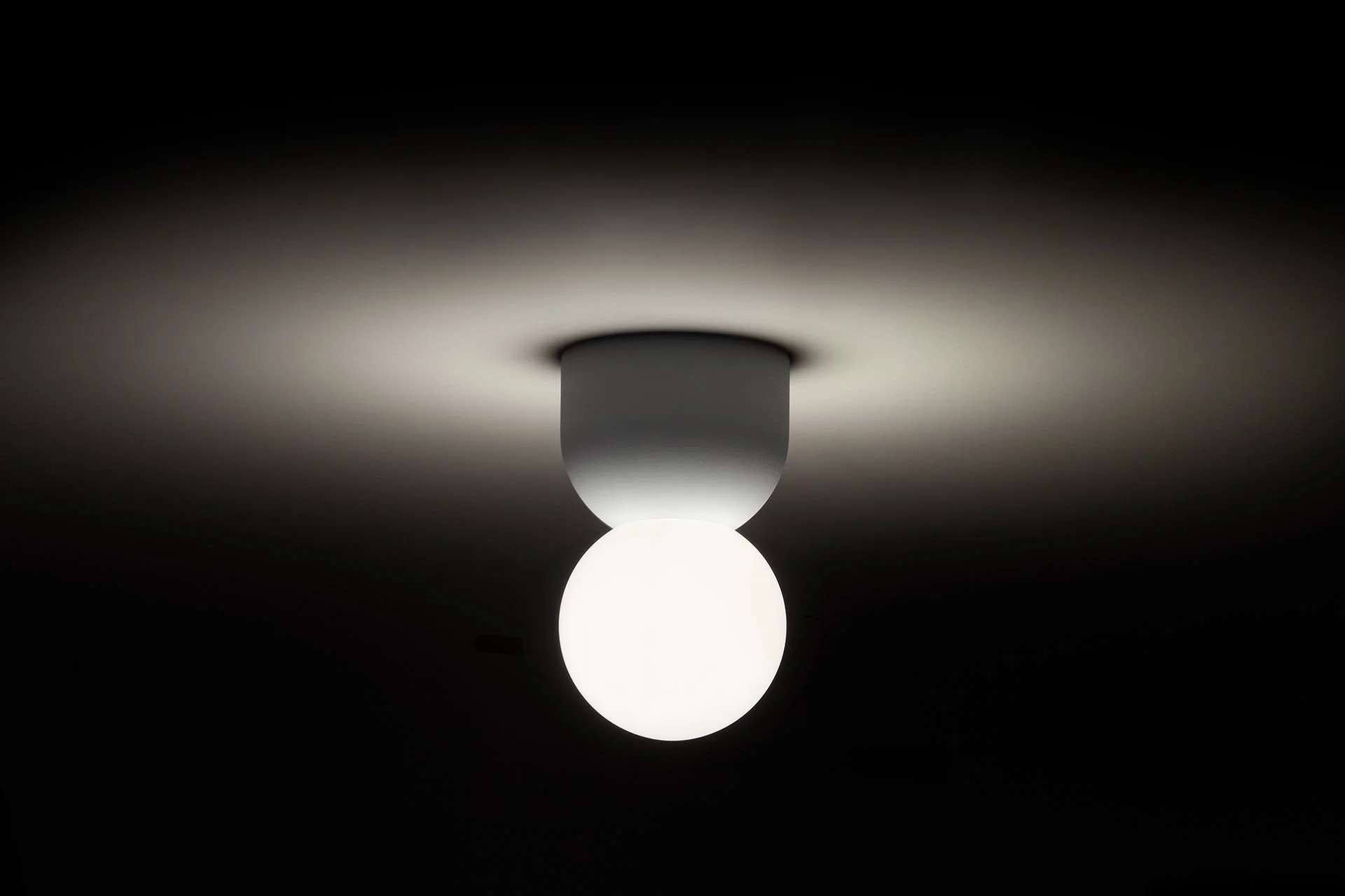 The BULLET owes its fluent design to the equal diameter of both the base and the glass. This ceiling lamp is also applicable as a wall lamp and is available in various colors with opal glass.