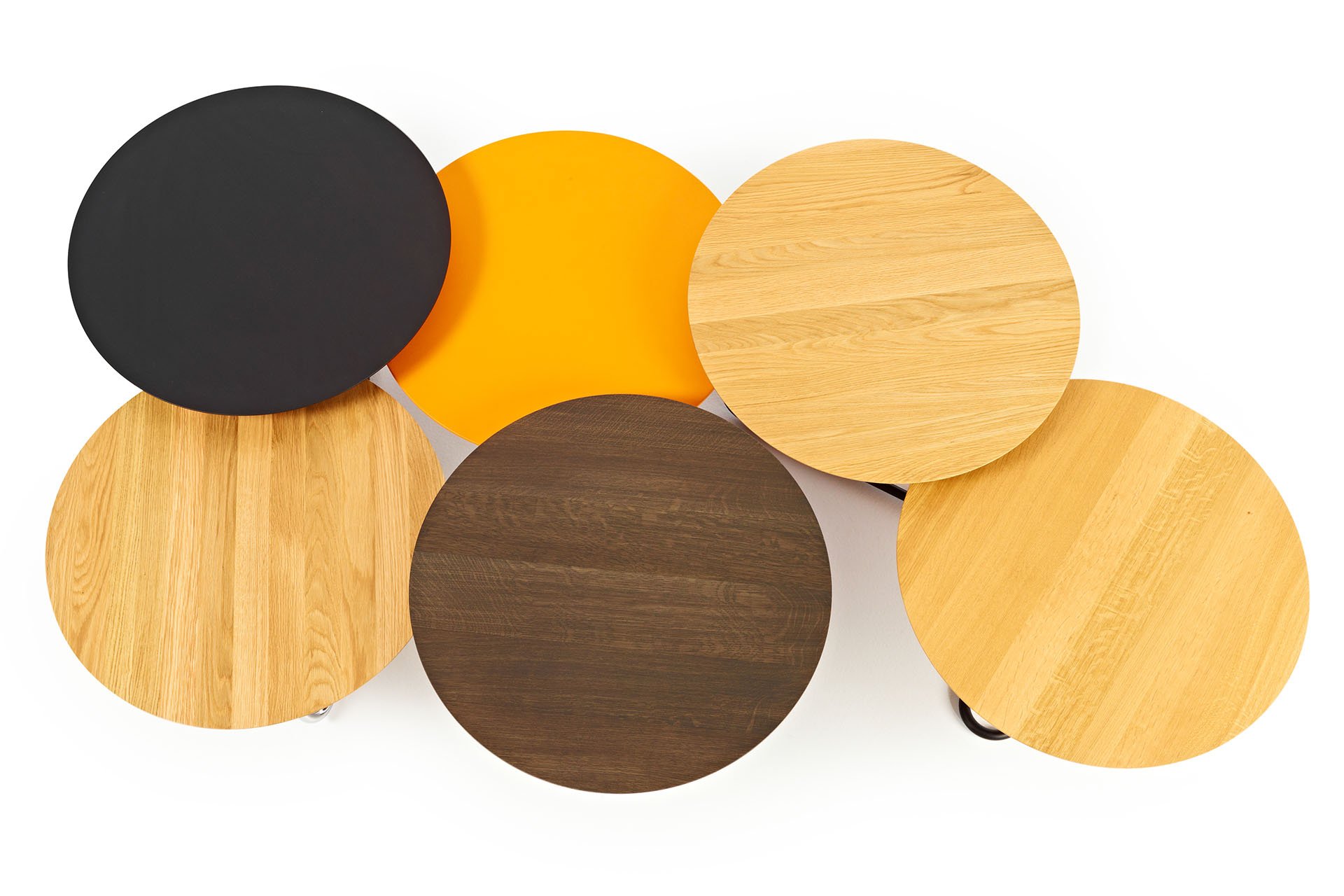 The family comprises a side table to put before and next to the sofa, a lower and wider round coffee table with two heights, an oblong coffee table and a long console using two of the same bases. This allows to create your own desired ideal coffee table setting according to your own style and needs. The table top itself can then be chosen in either stained oak or upholstered in leather, and the arched base could be either painted black or in chrome.